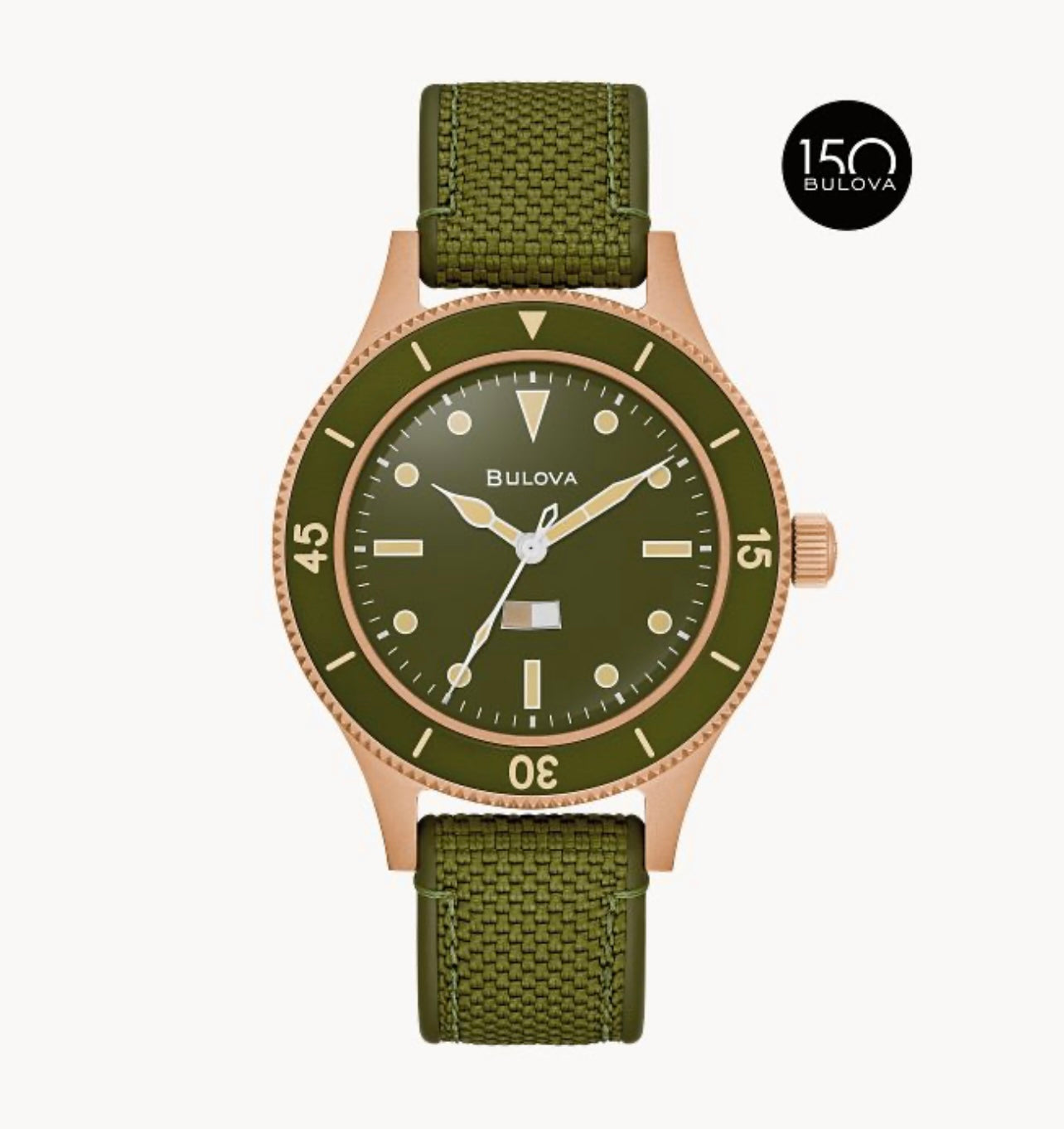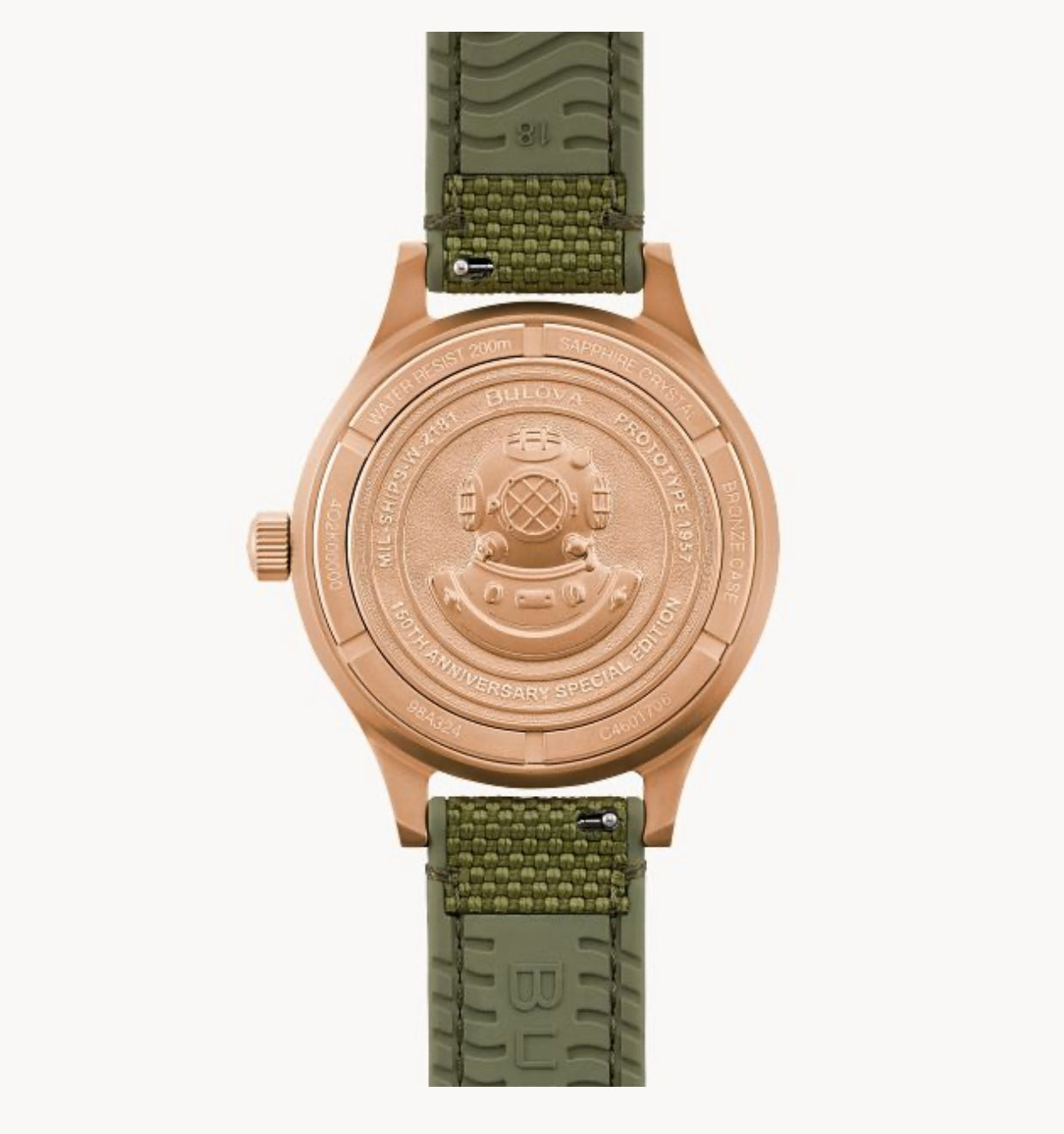 Special Edition MIL-SHIPS Bronze celebrates Bulova’s 150th Anniversary. This newly reimagined timepiece features an elevated design with a sandblast-finished case made of CuSn8 bronze, a lustrous material with a rose-gold hue.